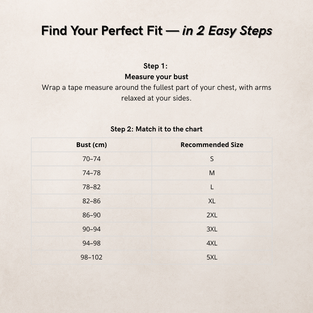We offer sizes S to 5XL — because every woman deserves to feel supported, no matter her shape. Be sure to check our size chart before ordering.